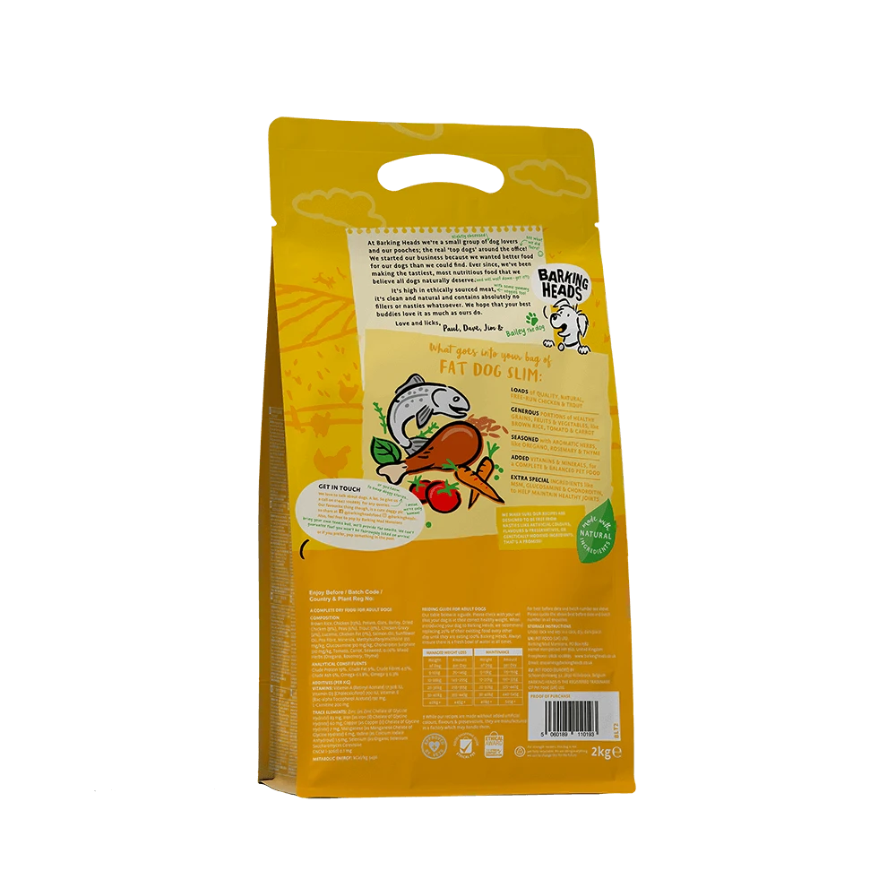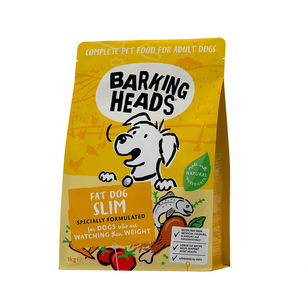 Barking Heads Fat Dog Slim dry dog food has been specially formulated for dogs who are watching their weight. This delicious lower-fat chicken recipe is high in fibre and uses only the best quality, natural ingredients. Approved by vets, this low-calorie complete adult dog food is ideal for those dogs looking to lose a pound or two!