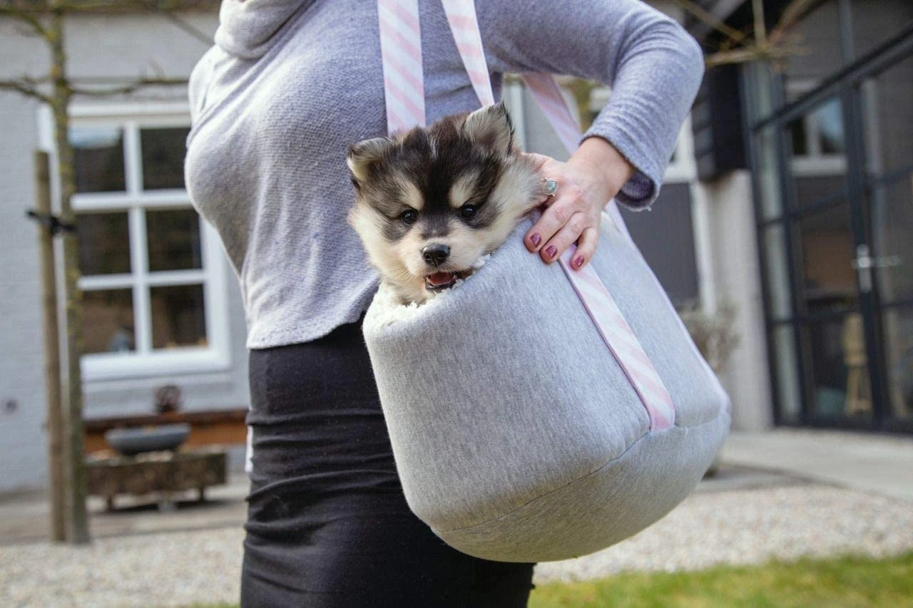 This fabric, fur-lined puppy travel bag is soft and warm, so your puppy is happy and comfortable when they need to be carried. Featuring a zipper closing on top, to put your puppy or small dog easily in the carrier. The dipped front means your puppy can happily enjoy the view. The puppy carrier bag is finished with two long, striped print handles so that the bag can be easily carried on the shoulder.
