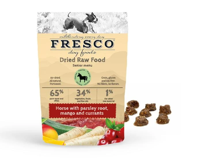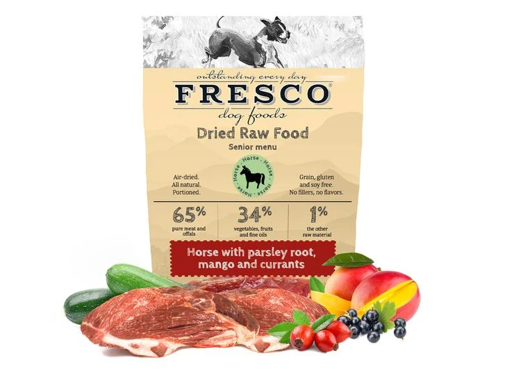 FRESCO Dry Raw Senior Horse Menus are created with simply pure horse meat, calcium bones, vegetables, fruits and high-quality oils, all necessary nutrients are included in these basic natural ingredients. Our Senior Menus are a great alternative to raw dog food diets all while maintaining a high-quality diet for your dog without any additional nasty ingredients.