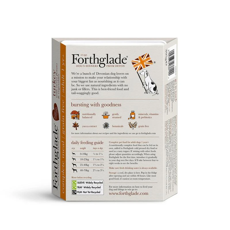 Naturally delicious, Forthglade’s nutritionally balanced adult grain-free turkey recipe wet dog food is free from junk & fillers, easy to digest and contains everything your dog needs to thrive. A tasty wet dog food made up of turkey, sweet potato and vegetables – Yum!