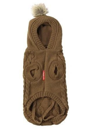 Cable hoody jumper for dogs. Features easy to fit jumper with back leg straps you can choose to use, back neck lead to collar space and fleece lined hood with faux fur pom pom.