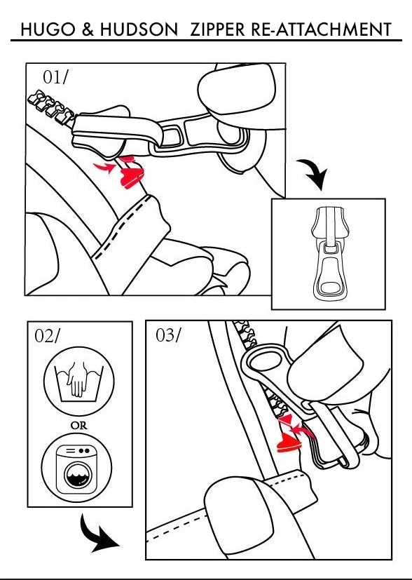 Please note, the zipper is removable to allow the coat to be machine washed, see re-attachment instructions in the images above.
