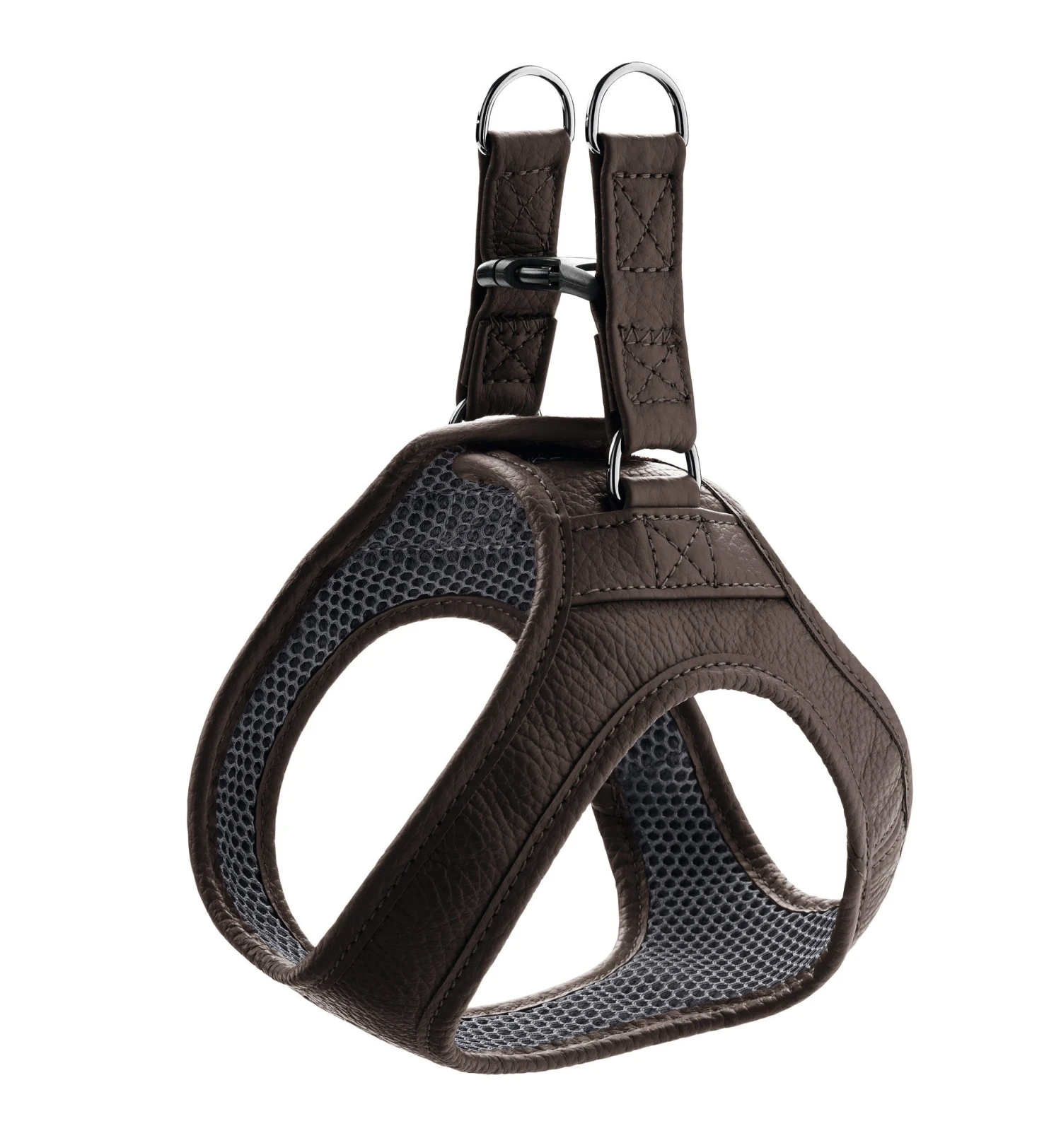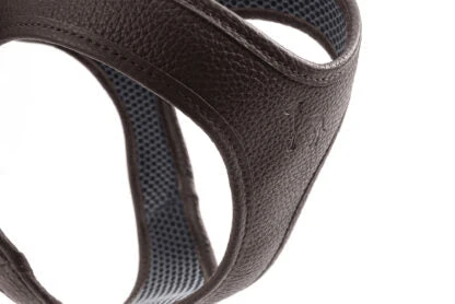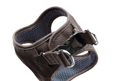 | The “Easy Step-In” harness HILO made of soft leather scores with its perfect fit and modern design. “Easy Step-In” – stands for uncomplicated dressing and undressing, which is made possible by only one nylon buckle and variable Velcro fastener. The dog can simply “step in” with the front legs, then the harness is pulled up to the left and right of the torso and closed with a click on the back. Ideal for head-shy dogs. Due to the cuddly fit the freedom of movement is almost unlimited. There is no disturbing webbing between the front legs. The moveable area between the harness and the two attachment rings ensures that the pull of the leash is distributed over the entire harness, thus relieving the buckle. The leather harness is padded with soft, breathable mesh material for extra comfort. |