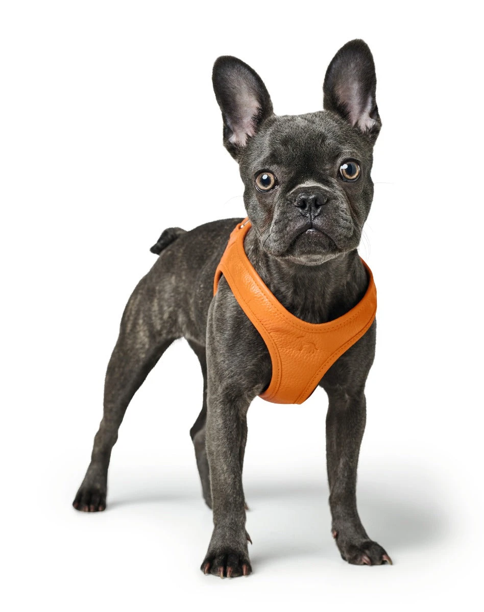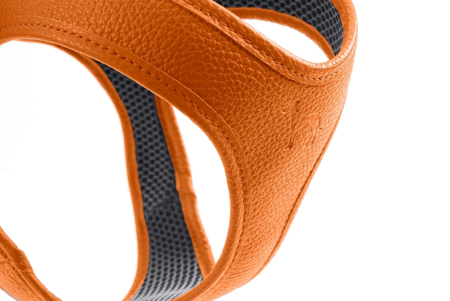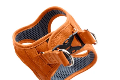 | The “Easy Step-In” harness HILO made of soft leather scores with its perfect fit and modern design. “Easy Step-In” – stands for uncomplicated dressing and undressing, which is made possible by only one nylon buckle and variable Velcro fastener. The dog can simply “step in” with the front legs, then the harness is pulled up to the left and right of the torso and closed with a click on the back. Ideal for head-shy dogs. Due to the cuddly fit the freedom of movement is almost unlimited. There is no disturbing webbing between the front legs. The moveable area between the harness and the two attachment rings ensures that the pull of the leash is distributed over the entire harness, thus relieving the buckle. The leather harness is padded with soft, breathable mesh material for extra comfort. |