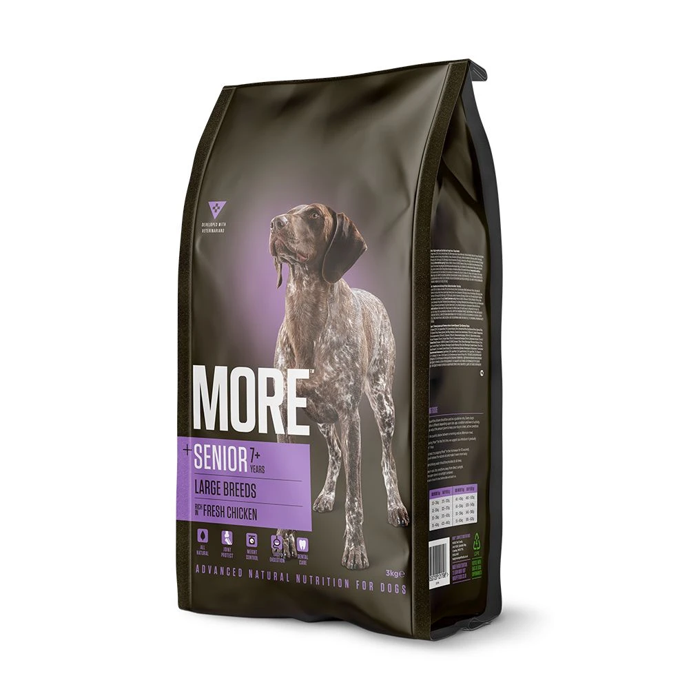 Moreâ„¢ Senior dog food for Large Breeds is formulated for the ageing and larger breed with high levels of joint care and added omega oils for optimum skin, coat and joint health. A lower protein diet helps to support your senior dog’s inner organs and a high-quality meat content ensures a tasty kibble that is easy to digest. This calorie-controlled diet helps your pet feel full and satisfied throughout the day.