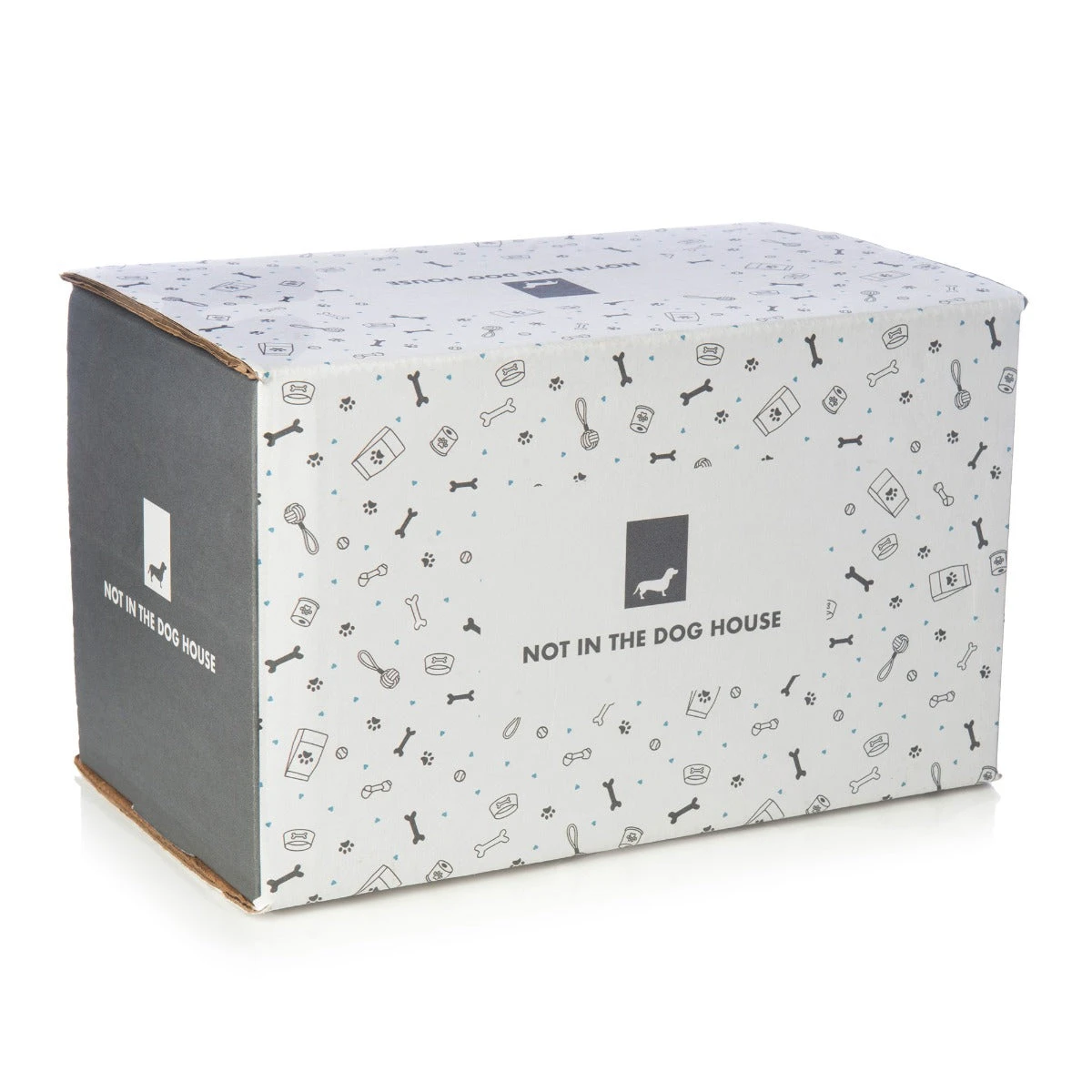 One of Not in the Dog House’s best selling dog gifts. This dog gift set includes a bottle of the famous “Pawsecco” a non-alcoholic, healthy pour-over food treat for dogs, a bag of Billy & Margot Popcorn for dogs, a box of Billy & Margot healthy dog training biscuits and a tube of Pooch and Mutt junk-free, healthy mini-bone dog treats. Packed into a simple Not in the Dog House branded gift box, lined with black tissue paper.