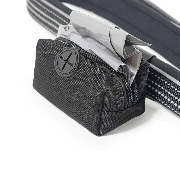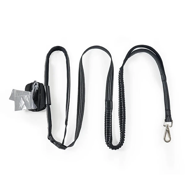 Reflective exercise waist lead made from water resistant nylon, featuring strong metal clasps. This lead possesses many features making it more convenient than just any regular lead. These include: Hands-free option – a dog leash belt that lets you freely use your phone or hold shopping bags. Handle at the end of the lead – for more control. Shock absorbing bungee section – stretched when the handle is pulled. This allows the dog to feel a gentle tug signalling to stop or wait. Zipped poop bag holder which is attached to the lead. 173cm approx.