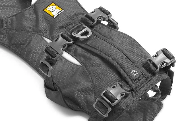 - Three leash attachment points: aluminum V-ring and two reinforced webbing loops