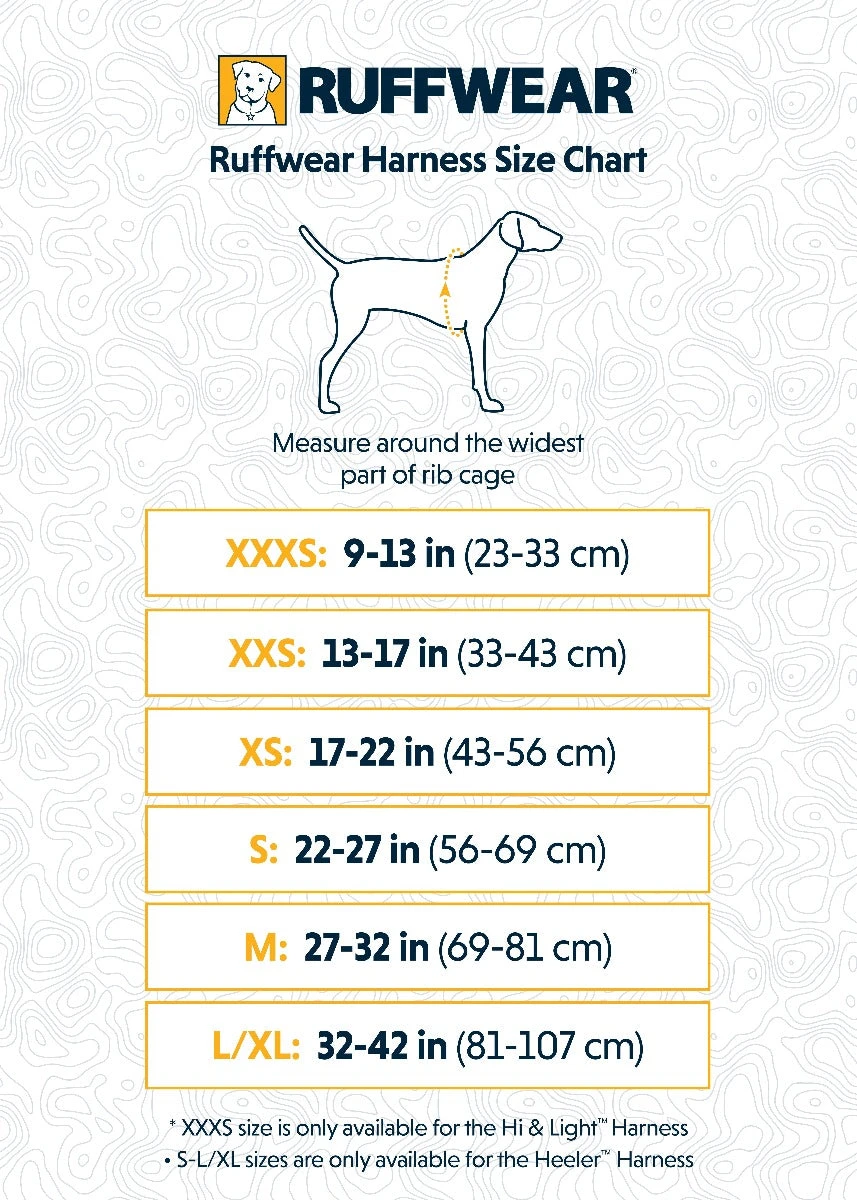 The Ruffwear Hi & Light™ Harness is a lightweight, low-profile adventure harness. This minimalist harness has four points of adjustment for a sleek, comfortable fit down to size XXXS. It features an aluminum V-ring leash attachment point on the back, a debris-resistant liner, reflective trim for low-light visibility, and a light loop for attaching The Beacon safety light. Scaled to fit even the smallest canine companions, the Hi & Light Harness is a great option for any dog that enjoys exploring in a harness.