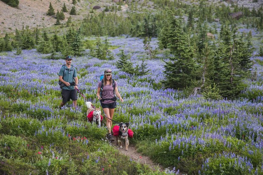 The Palisades Dog Pack enhances multi-day backcountry adventures with features like removable saddlebags, two collapsible hydration bladders, and a cross-load compression system. Four points of attachment securely connect the saddlebags to the modified Web Master Harness frame, ensuring load stability and comfortable weight distribution.