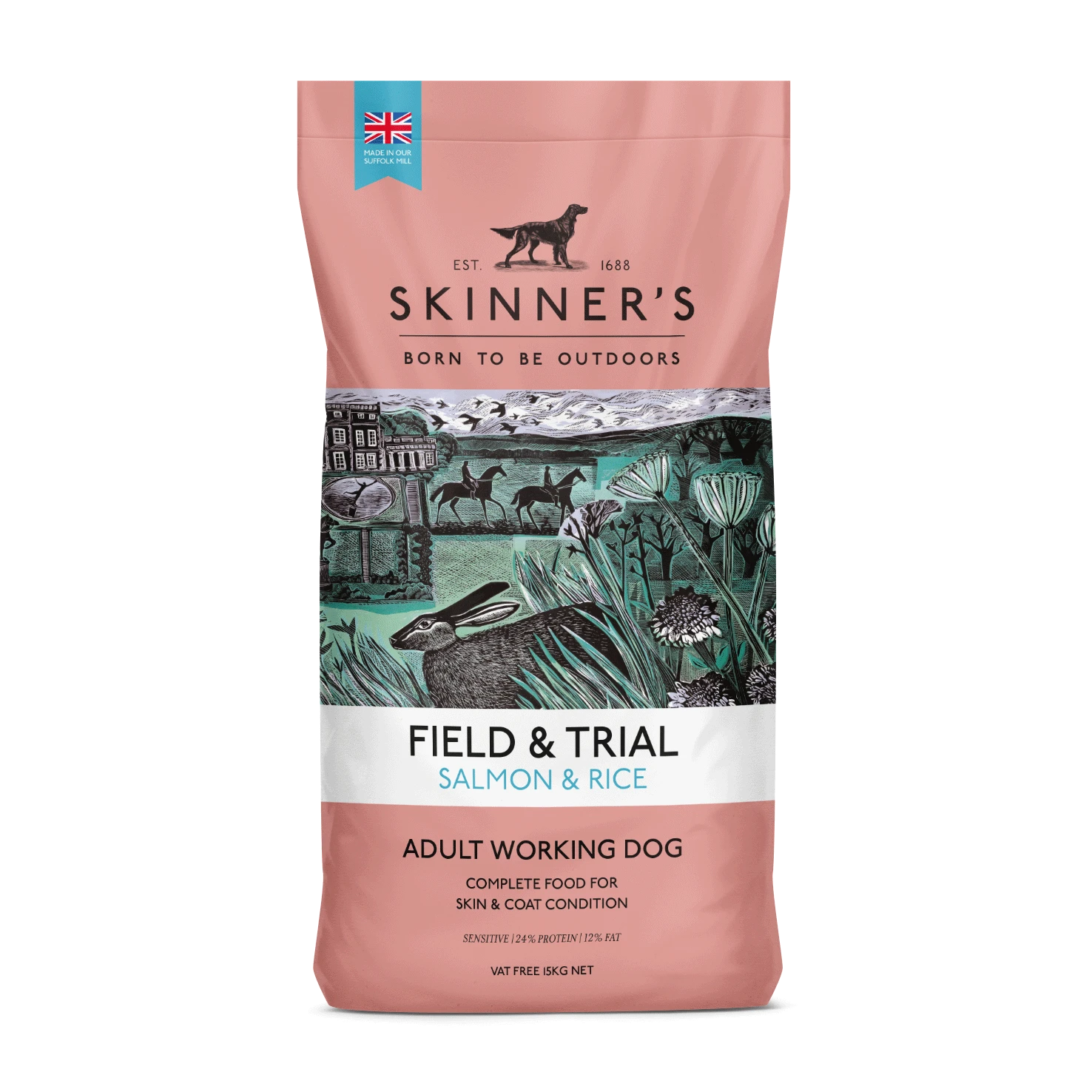 Skinners Field & Trial Salmon & Rice is a complete dog food, specially developed and formulated to support active dogs who are regularly working at a moderate activity intensity. Skinner’s Field & Trial Salmon and Rice has been carefully developed to include a protein level of 20% and a fat level of 12% to support the energetic requirements of a range of active dogs, such as working gundogs, agility dogs and active pet dogs. With protein being provided from digestible salmon meal, to support muscle integrity and development, and fat to support moderate performance output, Skinner’s Field & Trial Salmon and Rice is an ideal choice for a range of dogs. These factors, along with rice supplying digestible carbohydrate as an energy source, means that Skinner’s Field & Trial Salmon and Rice constitutes a diet to support the day-to-day requirements of active dogs.