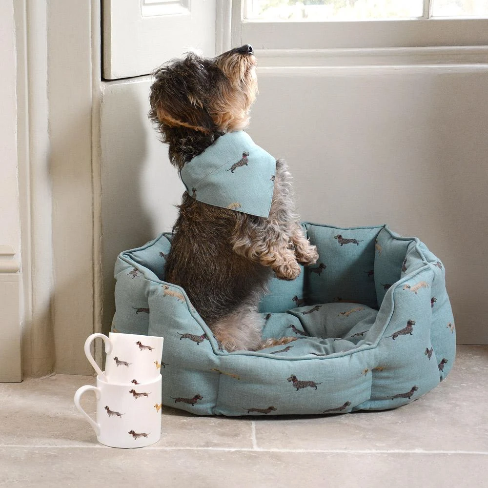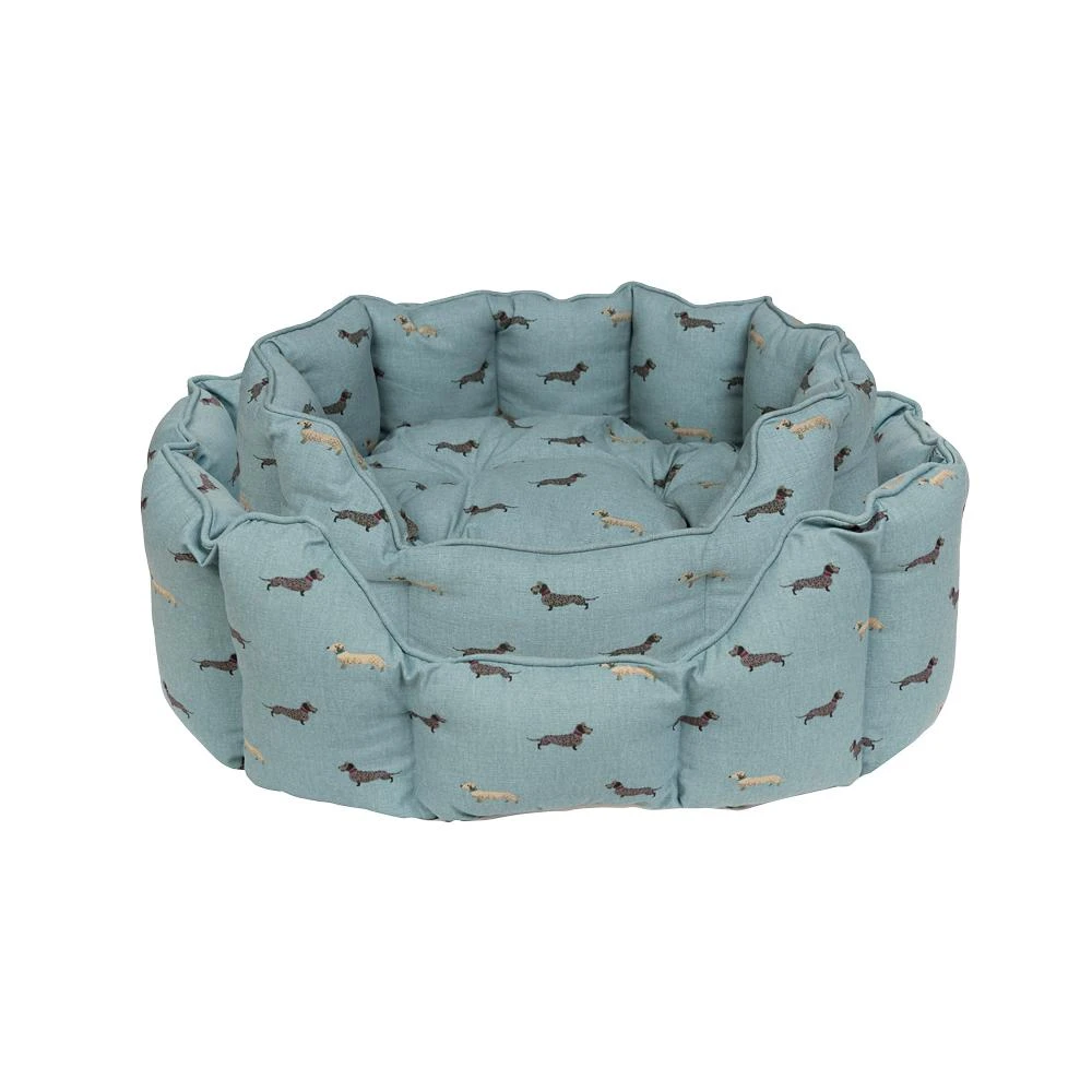 Sophie Allport’s oval shaped pet beds have deep filled fibre shoulders for enhanced comfort with a drop down front for easy access. A super cosy bed for your dog to curl up in.