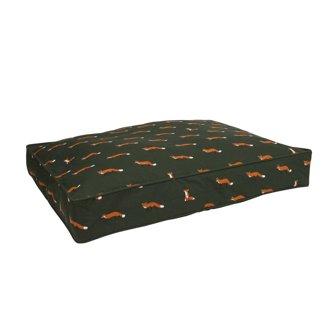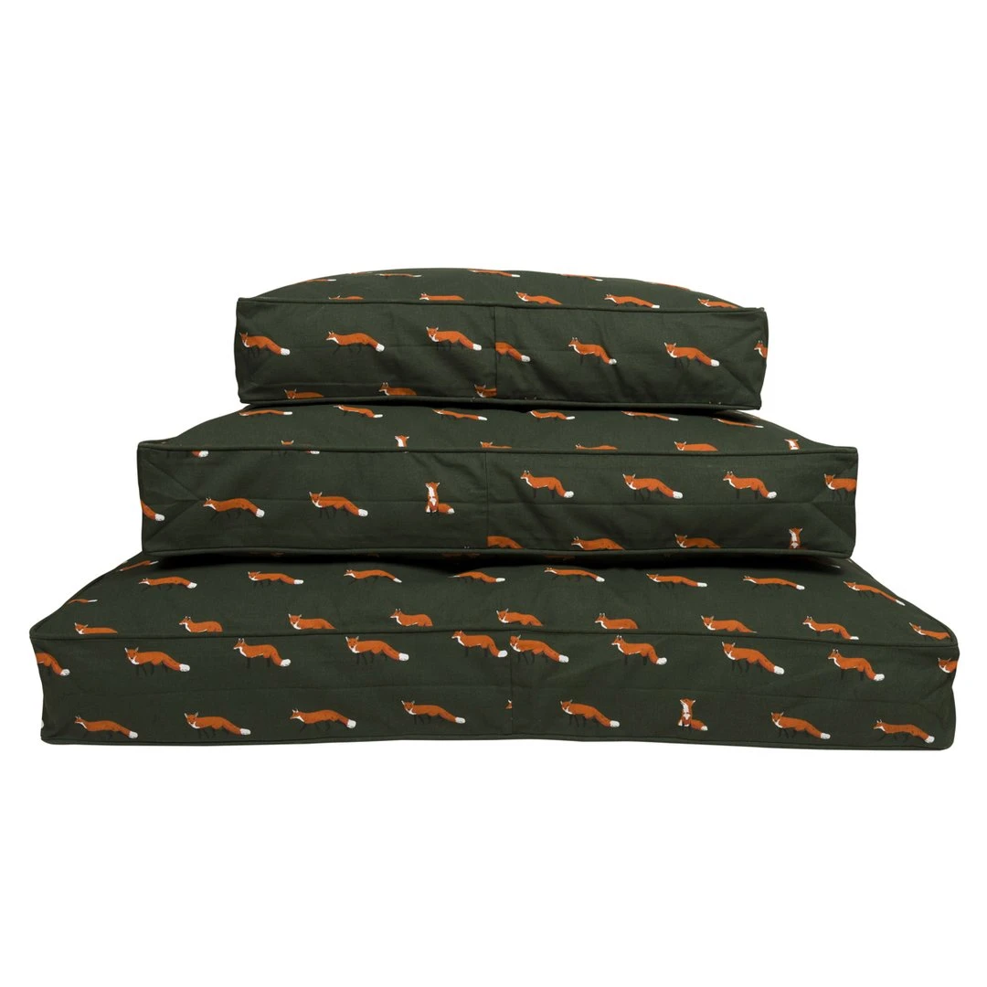 Inquisitive and charming, Sophie Allport cosy pet bed mattresses are covered in friendly red foxes on a regal forest green background.
