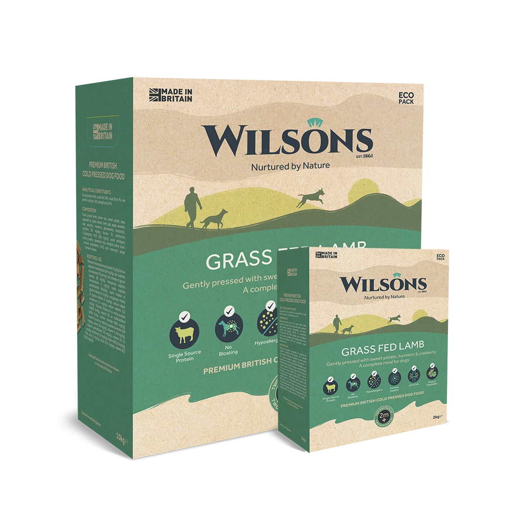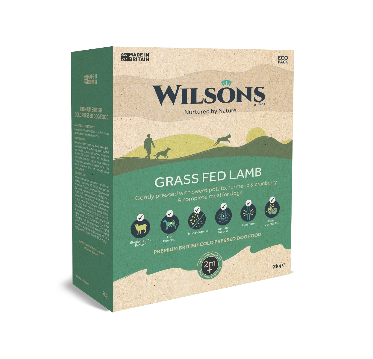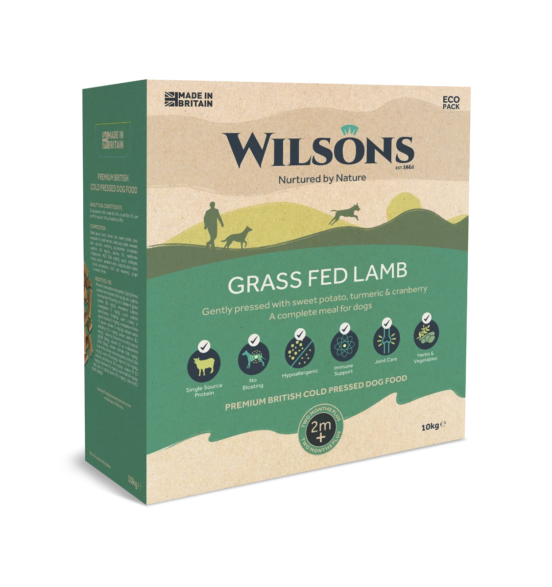 Available in 2kg or 10kg eco packs, Wilsons’ Grass Feb Lamb is a complete grain-free premium British dry dog food and is gently pressed withsweet potato, turmeric & cranberry in their Scottish factories.